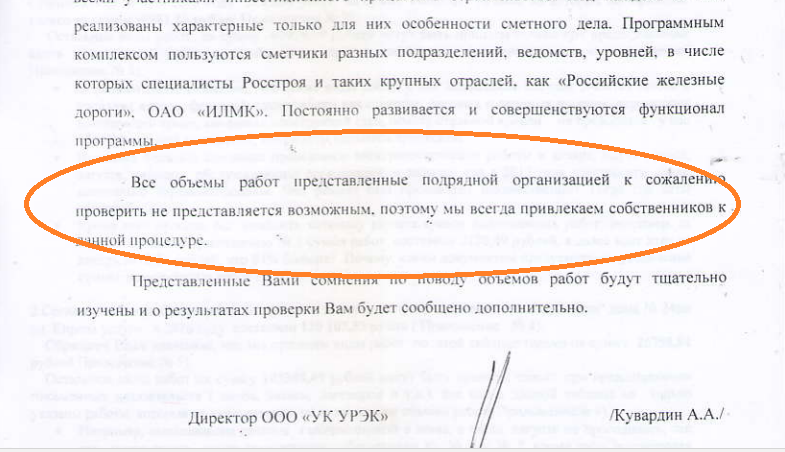 Два месяца они не могут добиться актов выполненных работ за 2016 год, а также перечня работ, которые были выполнены за 1 полугодие 2017 года. На эти просьбы, в частности, касательно работ, проведенных подрядной организацией, собственники получили уникальный ответ: «Все объемы работ, проведенные подрядной организацией, к сожалению, проверить не представляется возможным, поэтому мы всегда привлекаем собственников к данной процедуре».