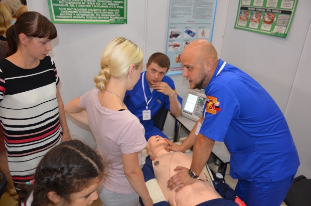 На экспозиционной площадке Территориального центра медицины катастроф посетители выставки активно проводили «сердечно-легочную реанимацию» на визуализированном реанимационном тренажере под руководством врача и фельдшера.