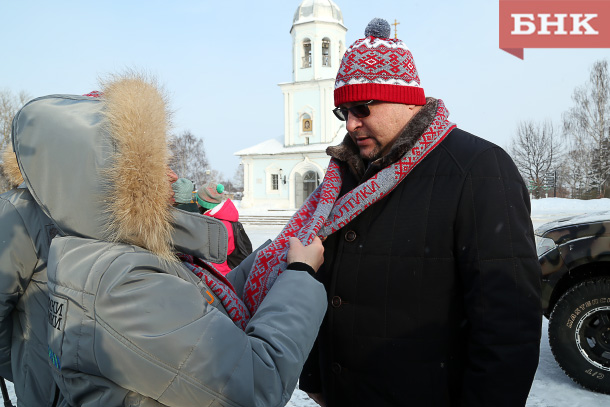 Олега Васильева торжественно посвятили в участники экспедиции – вручили шапку и шарф от творческой мастерской «Югыд арт». На них изображены традиционные коми символы, призванные защитить путешественников в дороге. Олег Васильев с радостью принял подарок и к удивлению путешественников признался, что сам является уроженцем Коми, а именно Воркуты.