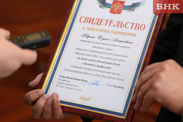 Оператор автоматической линии фанерного завода ООО «Жешартский ЛПК» Сергей Юдин за высокое профессиональное мастерство и плодотворную работу на благо республики получил из рук главы Коми Сергея Гапликова свидетельство о занесении его имени и портрета на Доску почета Республики Коми «Лучший по профессии».