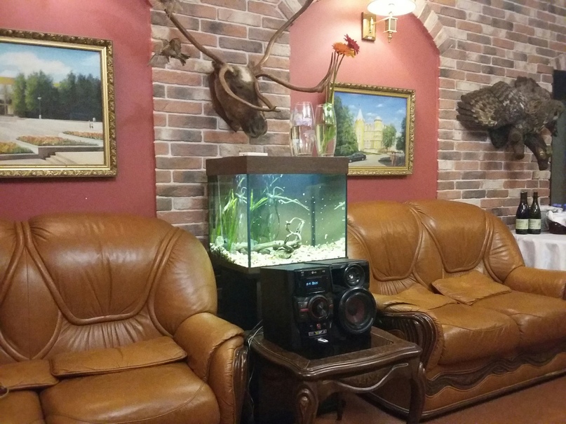 Тут и медведь с бочкой, и кабан, и олень с самоваром. Лисы, лоси, совы — полный сет русских стереотипов. Для любителей рыбалки добавили аквариум.