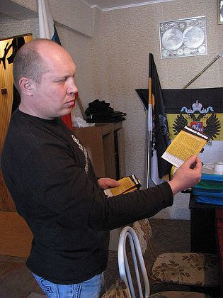 Первым делом, руководитель «Рубежа Севера» посетил воркутинский офис общественной организации, который порадовал гостей обилием имперских флагов. Похвалив молодых людей за приверженность делу, Юрий Авдошкин тут же начал раскладывать на столе привезенные с собой подарки – приличных размеров баннер, удостоверения, агитационные материалы, футболки с символикой, шевроны, имперские ленточки.