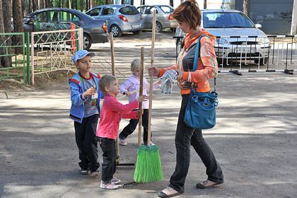 Было много детей. Они тоже с удовольствием и подметали и красили под руководством родителй.