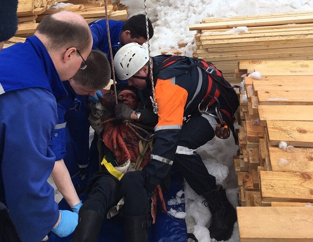 Перед спуском пострадавшего одели в специальный корсет и положили в предназначенную для спуска с высоты «косынку». Когда его спускали, рядом постоянно находился сопровождающий.