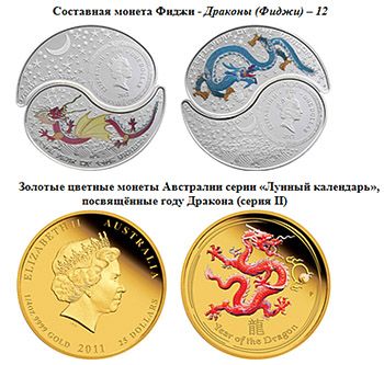 В этом году эта серия «Лунный календарь» представлена монетами практически всех монетных дворов мира (монеты австралийского монетного двора, польского, германского, монетного двора ЮАР). Уже сейчас есть в продаже австралийские и германские серебряные монеты весом 15,55 и 31.1 грамм. На подходе золотые монеты этой серии. Среди наиболее популярных монет – Дракон, Два дракона, Дракон с земным шаром, Дракон с жемчужиной, Дракон-процветание, Сказочный Дракон, Четыре дракона, монеты для детей, рожденных в этот год.