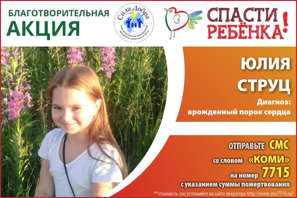На первый взгляд и не скажешь, что добрая и умная десятилетняя Юлия Струц из Воркуты больна. Она ходит в школу, общается со своими сверстниками. Единственное – не посещает уроки физкультуры и иногда пропускает занятия. У Юлии сложный врожденный порок сердца. Диагноз ей поставили в полгода, теперь девочке нужна операция, которая поможет сохранить ей жизнь.