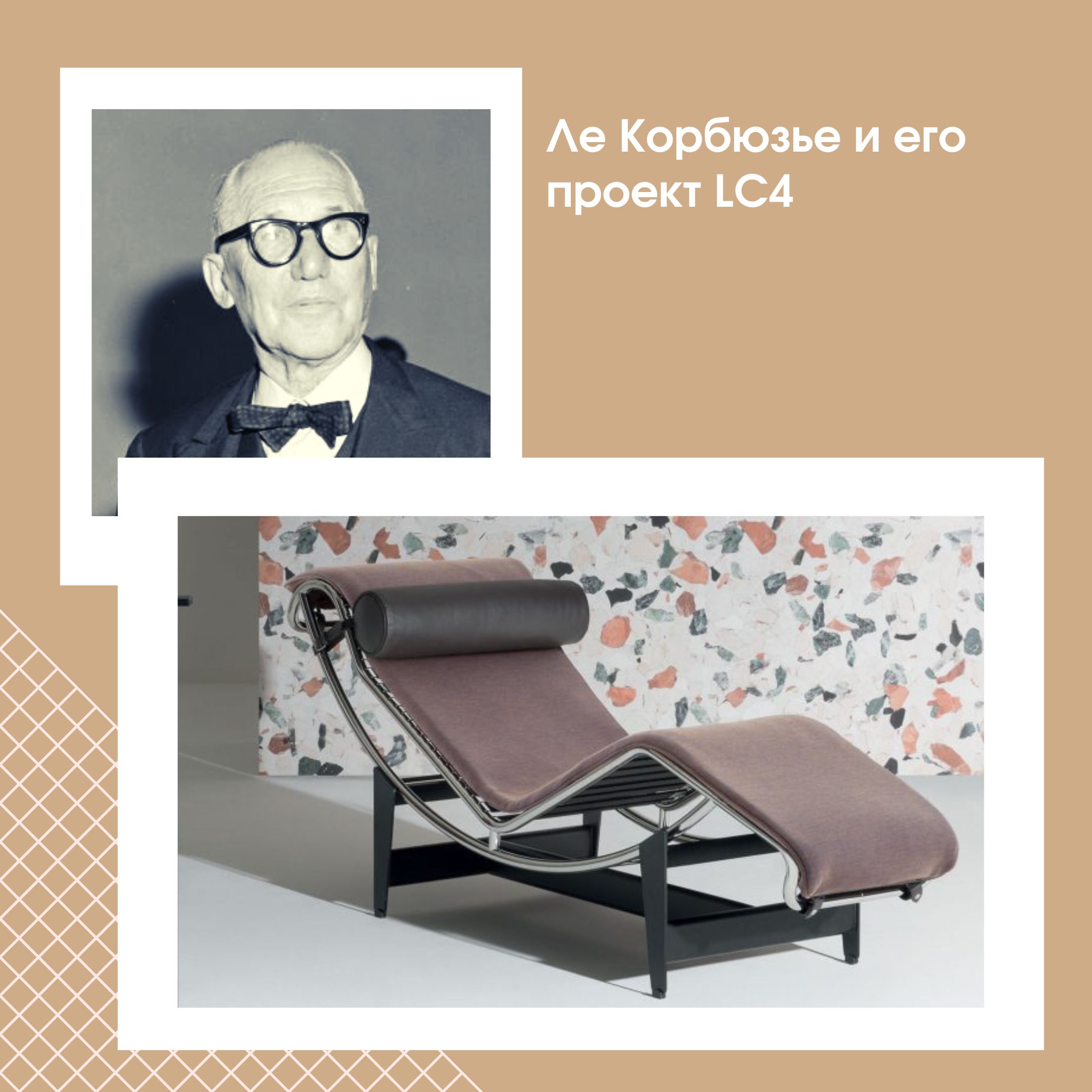 Одна из самых популярных моделей мебели от Корбюзье — кушетка LC4. Модель была впервые представлена на выставке Salon d'Automne в 1929 году. Оригинал находится в музее MoMA, а подписанные реплики можно приобрести по цене от 4 260 евро.