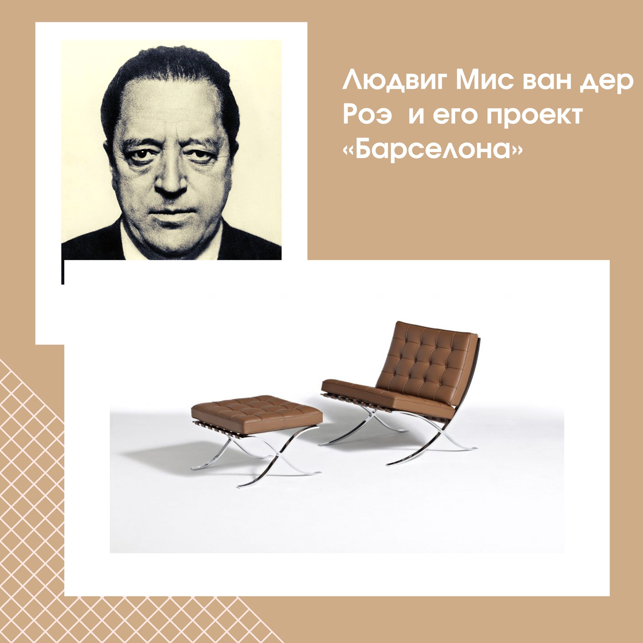 Людвиг Мис ван дер Роэ — немецкий архитектор-модернист, работавший в США. В 1929 году он разработал кресло «Барселона», которое популярно по сей день. Известен своими афоризмами «меньше значит больше» и «бог скрывается в деталях», в которых изложил свои ключевые взгляды на дизайн. До конца своей жизни он стремился создать нейтральное пространство с помощью универсальной и утонченной архитектуры.